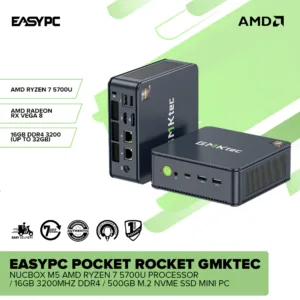 The EasyPC Pocket Rocket GMKtec NucBox M5 is a powerful and compact mini PC featuring the AMD Ryzen 7 5700U processor. With its efficient performance, fast DDR4 memory, and high-speed NVMe SSD, this device is ideal for multitasking, office work, content creation, and even light gaming. Its small form factor makes it perfect for space-saving setups without compromising power.