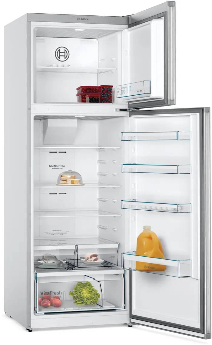 The Bosch KDN56XL30M is a 559-liter No-Frost refrigerator designed for optimal food preservation and convenience. Featuring MultiAirflow technology, a VitaFresh Plus compartment, and an energy-efficient compressor, this refrigerator ensures consistent cooling, extended freshness, and reduced power consumption. Its sleek stainless steel design adds a touch of elegance to any modern kitchen.