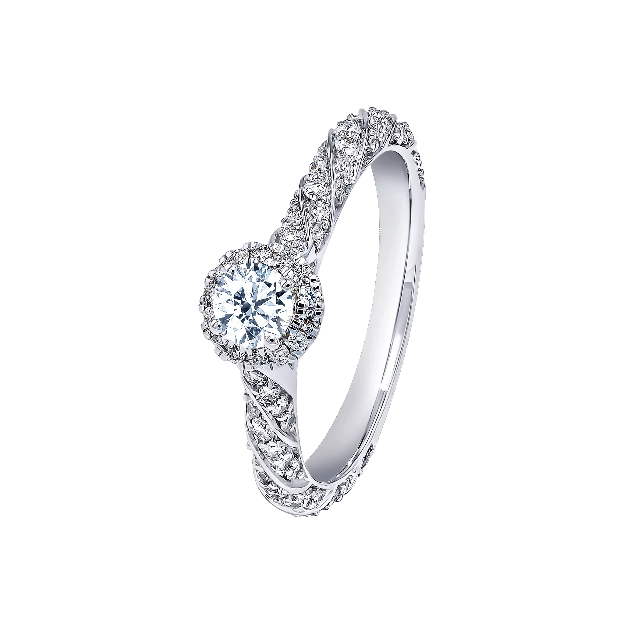This exquisite engagement ring from Damas features a stunning 0.3-carat round brilliant-cut diamond, celebrated for its unmatched sparkle and brilliance. The diamond is elegantly set on a sophisticated 18k gold band, which is intricately designed with a twisted pattern adorned with smaller accent diamonds. The timeless beauty of this ring makes it the perfect symbol of eternal love, designed to be cherished for a lifetime.